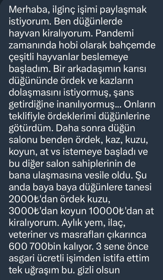 Pandemide hobi olarak başladığı hayvan besiciliğini sıra dışı bir kazanç kapısına dönüştüren bir girişimci, düğünlere hayvan kiralayarak aylık 600-700 bin TL gelir elde ettiğini açıkladı. Sosyal medyada gündem olan iş modeli, duyanları şaşkına çevirdi.