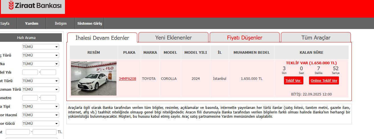 Ziraat Bankası’nın online ihale sistemine yansıyan son güncellemeler, bankanın ikinci el araç satışlarını bir üst seviyeye taşıdığını gösteriyor. Kısa süre öncesine kadar tek tük satış duyuruları yayımlayan banka, artık daha geniş kitlelere hitap eden, farklı marka ve modelden oluşan yüzlerce aracı listeye dahil etmiş durumda. İster “İhalesi Devam Edenler” listesinden anında teklif verebilir, isterseniz “Yeni Eklenenler” sekmesinden en güncel fırsatları yakalayabilirsiniz. Ayrıca, “Fiyatı Düşenler” bölümü de, pazarlık şansı arayanlar için cazip alternatifler sunuyor.